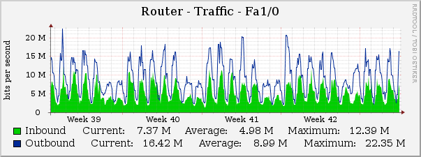 Zur totalen Sicherheit betreiben wir in einem weiteren Rechenzentrum einen weiteren Nagios Server welche den Nagios Cluster in Zürich von extern aus überwacht. Dieses Monitoringsystem überwacht zusätzlich unsere Router und Switches auf aussergewöhnliche Aktivitäten. Dieses System erstellt nebenbei mit Cacti ausführliche & aussagekräftige Grafiken mit welchen wir jederzeit über die Last/Traffic auf unseren Leitungen im Bilde sind.
